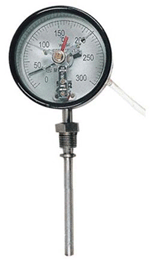 | 電接點雙金屬溫度計是利用溫度變化時帶動觸點變化,當其與上下限觸點接觸或斷開的同時,使電路中的繼電器動作,從而自動控制和報警。 |